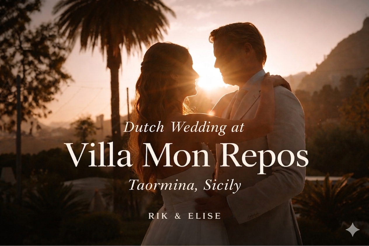 Couple: Rike & Elise Date: May 21, 2026 Venue: Villa Mon Repos — Taormina, Sicily Ceremony: Symbolic — English and Dutch Celebrant: Wendy Keizer Bridal gown: Pronovias Florals: Toscano Fiori Hair: Loredana Calandra Makeup: Dalila La Colla Music: Ancora, Ancora, Ancora — Mark Ronson Remix Style: Lemons · Blue & White · Mediterranean elegance